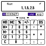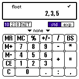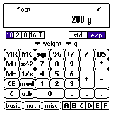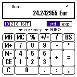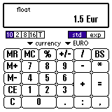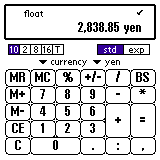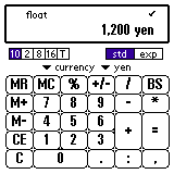 1200と入力し、単位のプルダウンから 「通貨(currency)」->「円(yen)」を選んでください。 "+" を押してください。 1.5と入力し、単位から「ユーロ(EURO)」を選んでください。 次に "+" を押すと計算結果が円で表示されます。 さらに、8ポンドと入力し "=" を押すと、、、 合計が円で表示されます。 ここで単位を換えればユーロ、ポンドなどでも表示できます。 二つの値を計算する場合、単位は最初に入力した値にそろえられます。 また、「通貨」と「長さ」など、異なる単位を入力すると 換算せずにそのまま計算します。