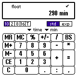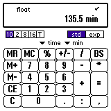 「2:15:30」と入力してください。 "=" を押してください。 単位から「分(min)」を選ぶと、分に換算した値が表示されます。 ":" を押すと自動的に表示形式が "T"(= time)に、 単位が "HMS"(= 時:分:秒)になります。 もちろん手動で変えてもかまいません。