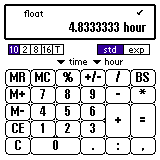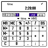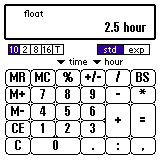 「1:10」、"*" と入力してください。(秒は省略可) "2" を押してください。 "+" を押すとここまでの計算結果が表示されます。 さらに「2.5」と入力し、単位を「時間(hour)」に変更してください。 "=" を押すと結果が表示されます。 もちろん、単位を換えれば時間表示や、、、 分表示も可能です。