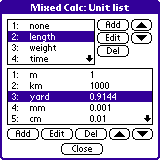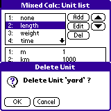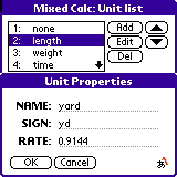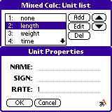 「追加(Add)」を選ぶとあらたな単位(あるいは単位系)を追加できます。 修正する場合には「編集(Edit)」を押してください。 「名前(NAME)」に単位の名前、「記号(SIGN)」に略称を入力してください。 「換算(RATE)」には、単位どうしの比率を入力してください。 たとえば長さはメートルが「1」なので、ヤードは「0.9144(m)」になります。 不要な単位を削除する場合には「削除(Del)」を押してください。 単位を選んで上下ボタンを押すと、単位の順番を入れ替えることができます。 順番を入れ替えると、計算画面での表示順が変わります。