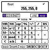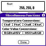 "exp" ボタンを押してエキスパート画面を表示してください。 「255, 255, 0」と入力し、"=" を押して下さい。 16進数で「FF, FF, 0」としてもかまいません。 "misc" ボタンを押すと小さいウィンドウが表示されます。 ここで "RGBtoHSV" ボタンを押すと、、、 HSV に換算した値が表示されます。 さらにたとえば + 180, 0, 0 として 色相(H)を180度移動させ "HSVtoRGB" ボタンを押すと、、、 黄緑の補色(色合いが正反対の色)を知ることもできます。 RGB と HSV の間の変換方法は、アプリケーションによって異なるようです。 Mixed Calc では Adobe PHOTOSHOP の変換方法を参考にしています。